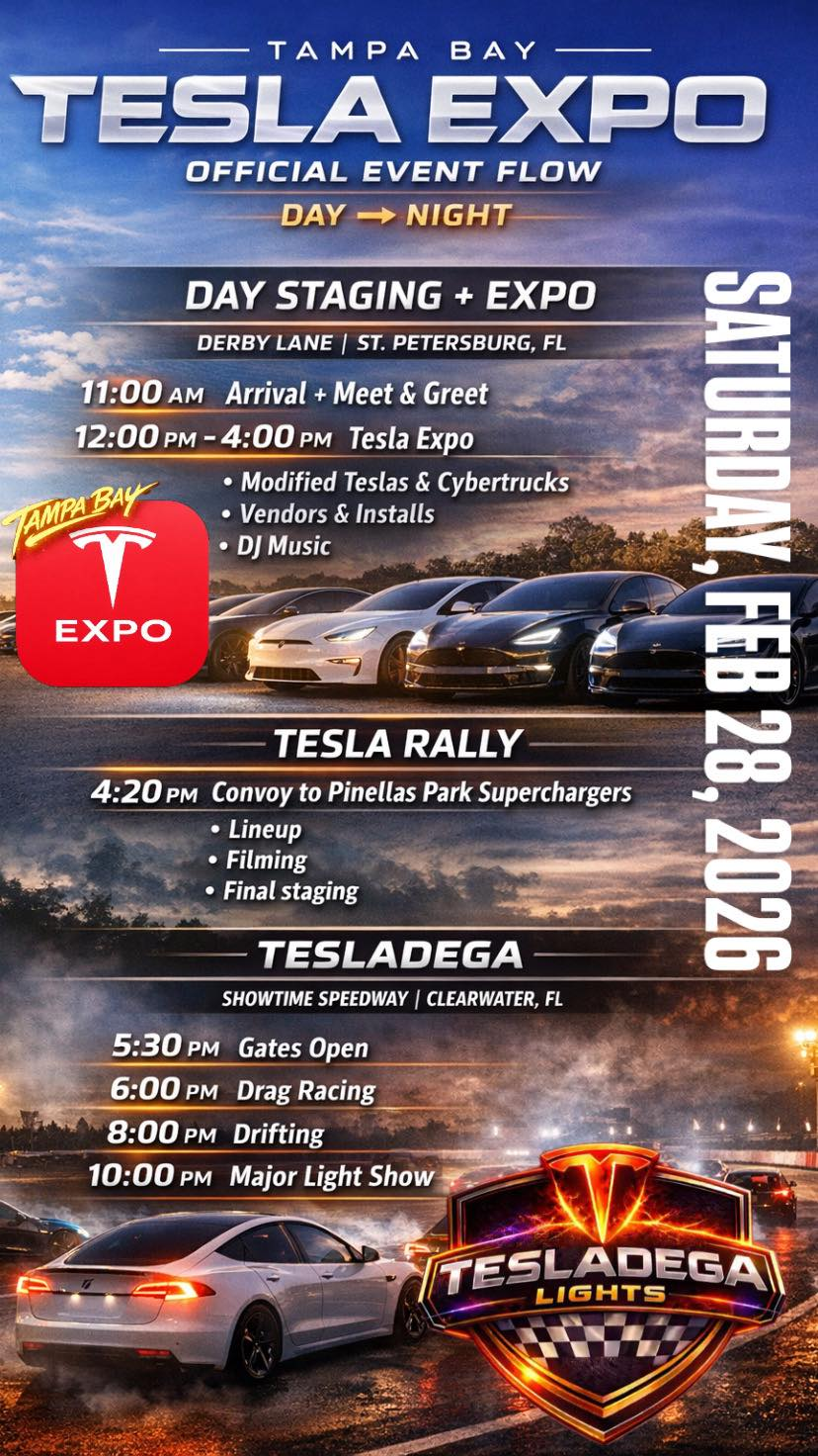 TESLA EXPO daytime exhibits are free / RSVP-based at multi-location stops. Speedway entry, racing, drifting, and TESLADEGA LIGHTS spectator access take place separately at the speedway.